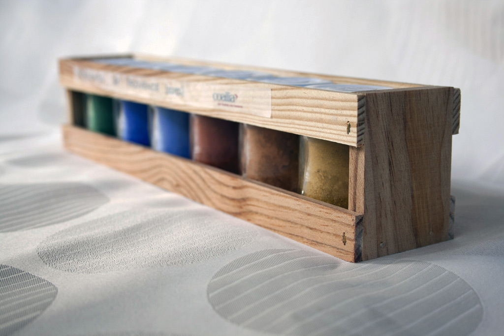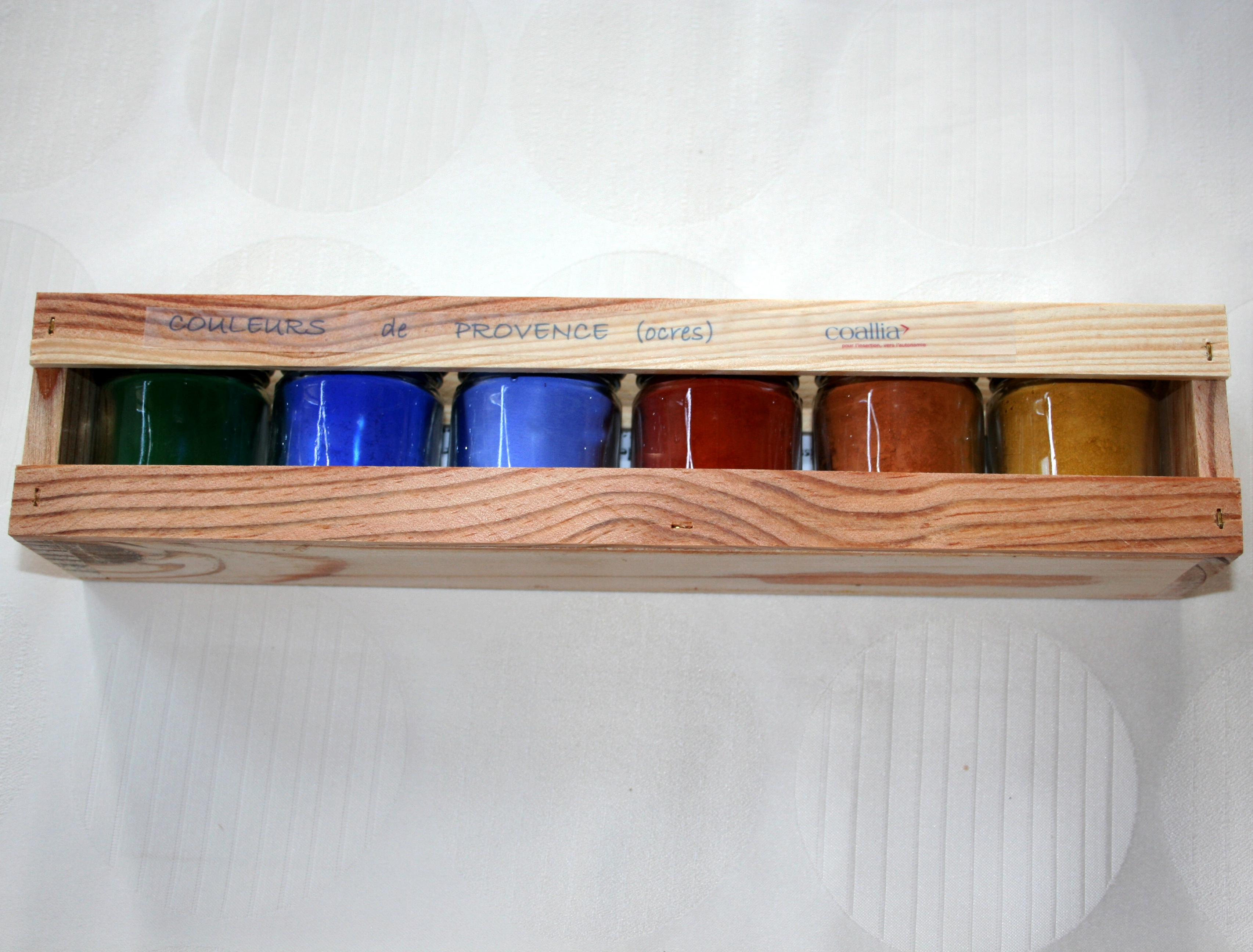Ensemble de 6 pots d’oxydes de pigments colorés.