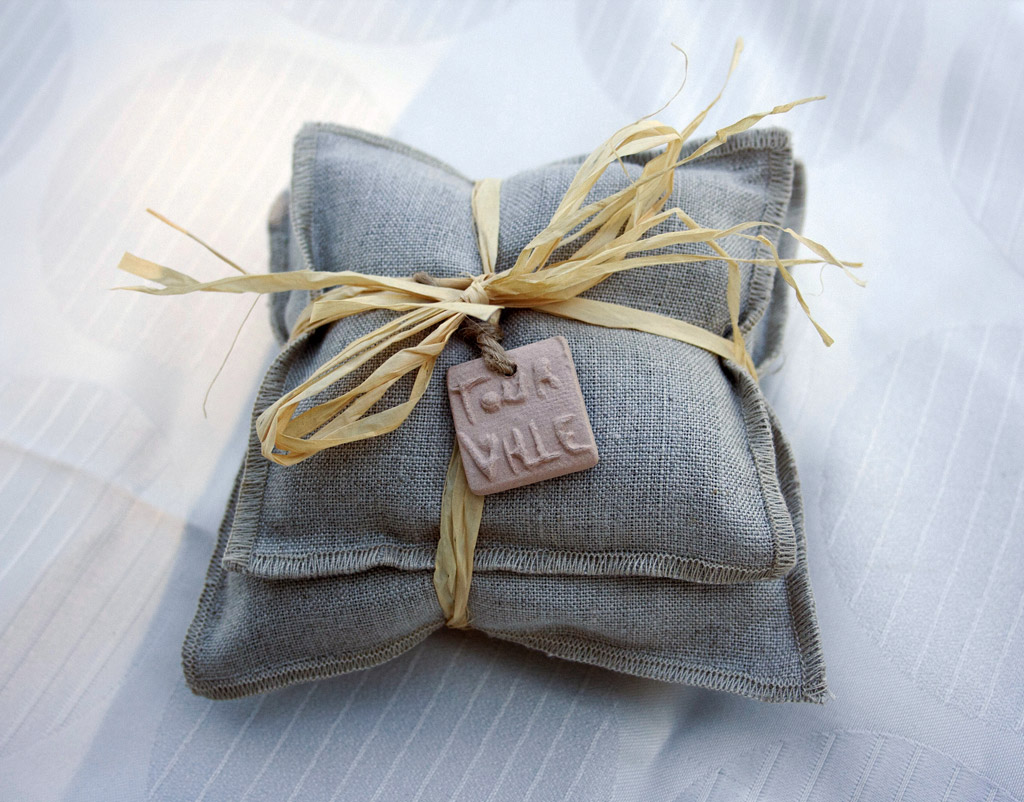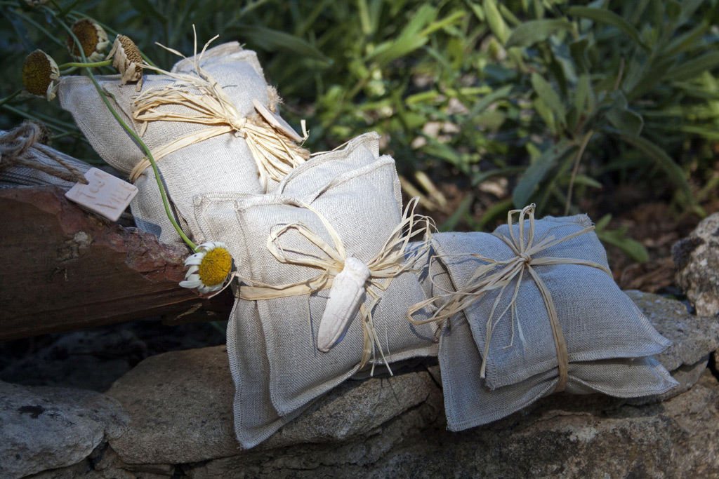 Un coussin 11 cm x 11 cm (20 g de lavandin) et un coussin 9 cm x 9cm (30 g de lavandin).
