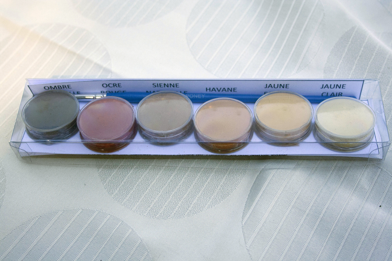 Réglette comprenant 6 boites d’ocres naturelles et son pinceau .